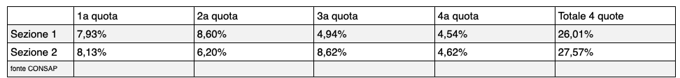 A tal proposito la tabella che segue illustra le erogazioni in percentuali del Fondo per le quattro quote distinte relative alle due sezioni in cui è articolato il Fondo. La percentuale è relativa al danno rimborsabile.