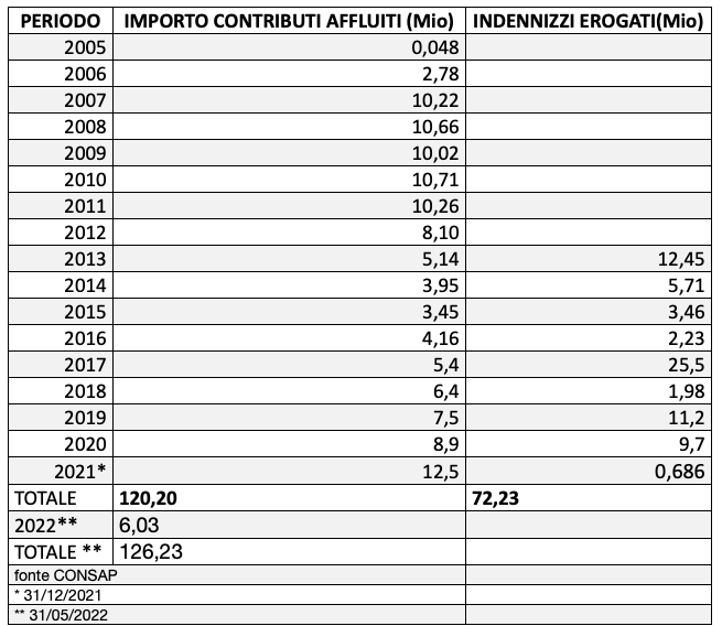 La prima tabella, fonte CONSAP, propone nella seconda colonna l’importo dei contributi affluiti al Fondo a partire dal 2005 in milioni di €. Nella terza gli indennizzi erogati, sempre in milioni di €. Per indennizzi erogati si intendono le quote ristorate sul c/c degli aventi diritto per le tre rate tra 2013 e 2021. Le quote risultano spalmate nel corso degli anni per effetto delle procedure di erogazione, del recupero di aventi diritto, successioni ecc.
