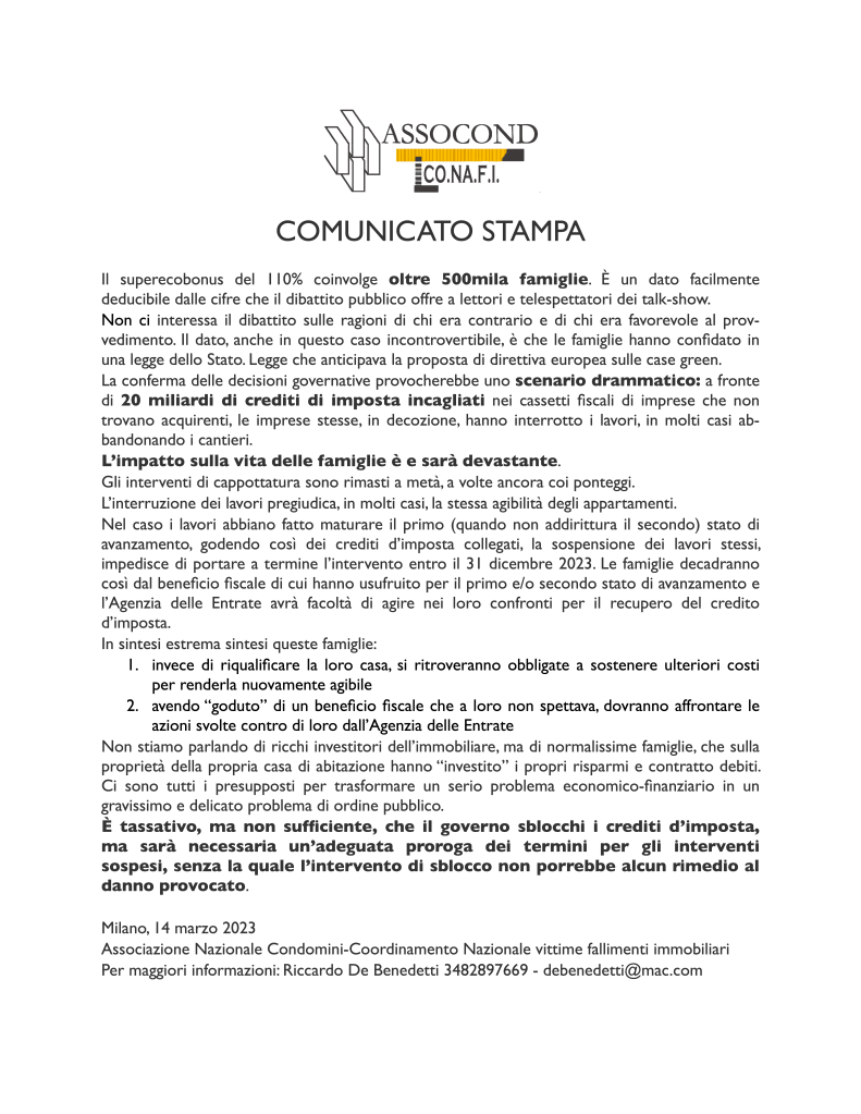 Qui il comunicato stampa di Assocond-Conafi sulla drammatica vicenda del superbonus. Come nella questione dei fallimenti immobiliari non si è capito, non si è voluto far comprendere, che a pagare una normativa mal scritta e ancor più mal applicata saranno le famiglie. Alle quali l’Agenzia delle Entrate andrà a chiedere, non subito, ma in tempi meno lunghi di quel che si crede, i crediti d’imposta a cui le aziende, nel frattempo decotte e passate a miglior vita, non potranno far fronte.